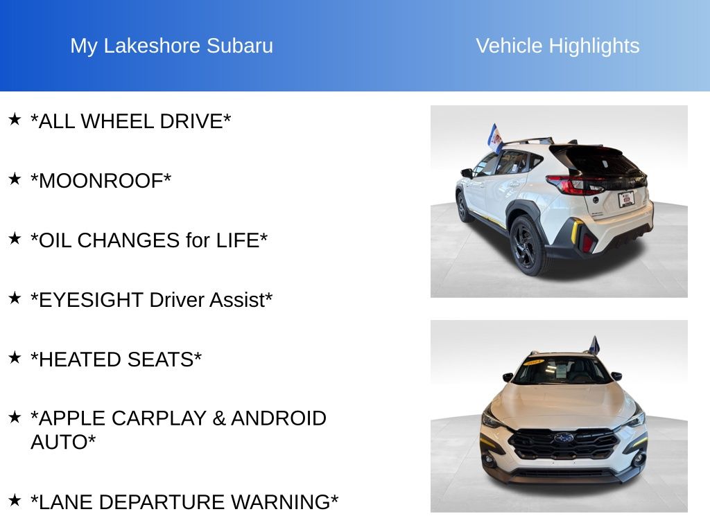 Crosstrek Sport, Crystal White Pearl, *ALL WHEEL DRIVE*, *APPLE CARPLAY & ANDROID AUTO*, *EYESIGHT Driver Assist*, *HEATED SEATS*, *LANE DEPARTURE WARNING*, *MOONROOF*, *OIL CHANGES for LIFE*, 10-Way Power Driver's Seat, Blind Spot Detection w/Rear Cross-Traffic Alert, BSD/RCTA & Power Driver Seat & Power Moonroof, Power Moonroof. Certified. Crystal White Pearl 2024 Subaru Crosstrek Sport AWD Lineartronic CVT 2.5L 4-Cylinder DOHC 16V