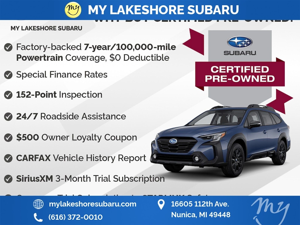 My Lakeshore Subaru is your #1 choice in Michigan to get the BEST PRICE on used vehicles and BEST value for your trade. The My Lakeshore Subaru team is ready to provide you with a world-class experience, ensuring that you find the perfect vehicle that fits all your needs. Every vehicle has been through a full safety inspection completed by certified technicians and fully detailed. We sell many makes and models, Certified Pre-owned Subaru’s and Pre-owned Vehicles with years from 2025-2024-2023-2022-2021-2020-2019-2018-2017-2016-2015-2014-2013-2012-2011-2010-2009-2008-2007 and all makes Audi, BMW, Chevrolet, Toyota, Volkswagen, Kia, Hyundai, Mazda, Mercedes, Dodge, Chrysler, Jeep, Ram, Lincoln, Honda, Subaru, and many models like Crosstrek, Outback, Forester, Accent, Legacy, WRX, BRZ, Solterra, and more. Take advantage of our VIP experience by calling 231-867-6957 to schedule a test drive. Read our customer reviews and view our entire selection of preowned vehicles at www.mylakeshoresubaru.com, or stop by today, located at 16605 112th Ave, Nunica, MI 49448. 27/35 City/Highway MPG