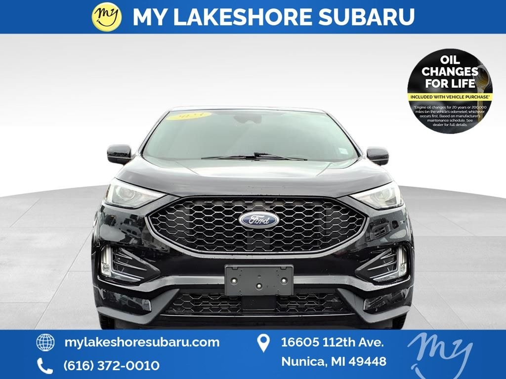 AWD, *ADAPTIVE CRUISE*, *ALL WHEEL DRIVE*, *APPLE CARPLAY & ANDROID AUTO*, *HEATED SEATS*, *LANE DEPARTURE WARNING*, *OIL CHANGES for LIFE*, ABS brakes, Adaptive Cruise Control w/Stop & Go, Alloy wheels, Compass, Connected Built-In Navigation, Electronic Stability Control, Evasive Steering Assist, Ford Co-Pilot360 Assist+, Front dual zone A/C, Heated door mirrors, Heated front seats, Illuminated entry, Lane Centering, Low tire pressure warning, Power Liftgate, Remote keyless entry, Traction control. Agate Black Metallic 2023 Ford Edge ST Line AWD 8-Speed Automatic EcoBoost 2.0L I4 GTDi DOHC Turbocharged VCT