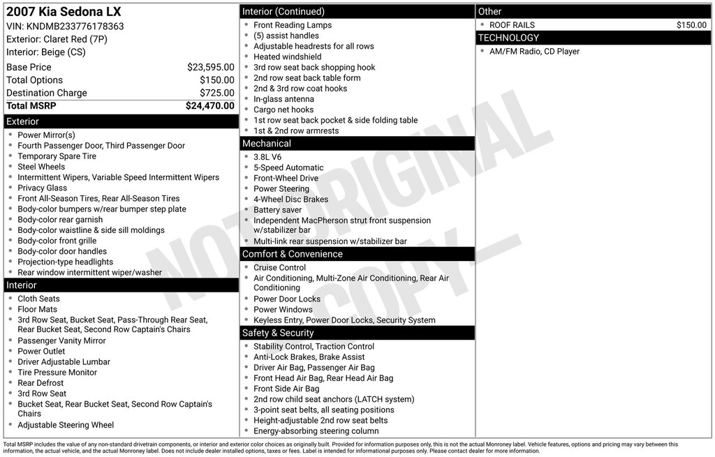 Sedona LX, Claret Red, *LOCAL TRADE*. Claret Red 2007 Kia Sedona LX FWD 5-Speed Automatic with Overdrive 3.8L V6 MPI DOHC CVVT