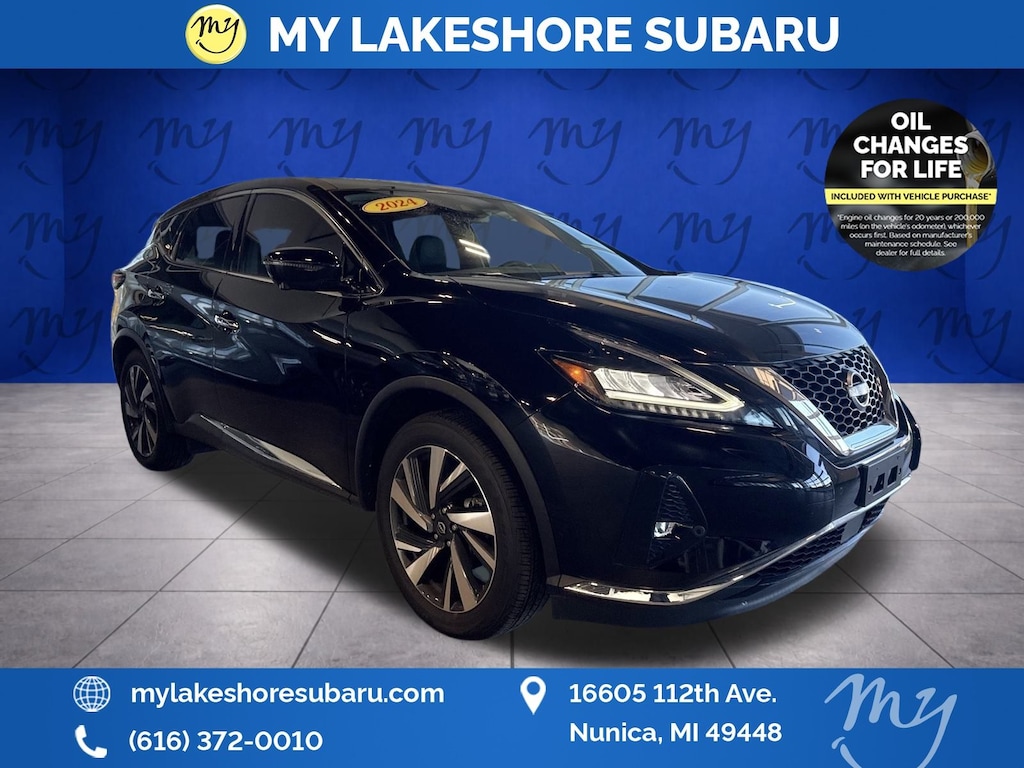 Murano SL, AWD, Super Black, *ALL WHEEL DRIVE*, *APPLE CARPLAY & ANDROID AUTO*, *BLIND SPOT MONITORING*, *HEATED REAR Seats*, *HEATED STEERING WHEEL*, *LANE DEPARTURE WARNING*, *LEATHER HEATED POWER SEATS*, *LOCAL TRADE*, *OIL CHANGES for LIFE*, *PANORAMIC MOONROOF*, *REARVIEW CAMERA*. Super Black 2024 Nissan Murano SL AWD CVT with Xtronic 3.5L V6 DOHC 24V