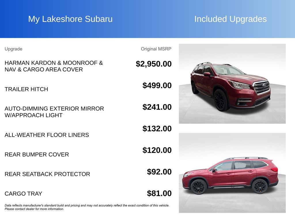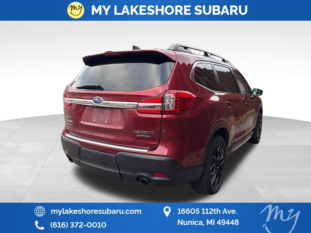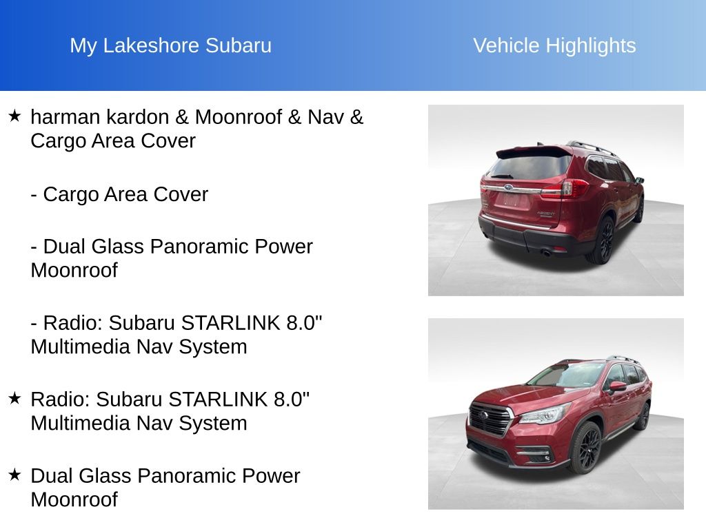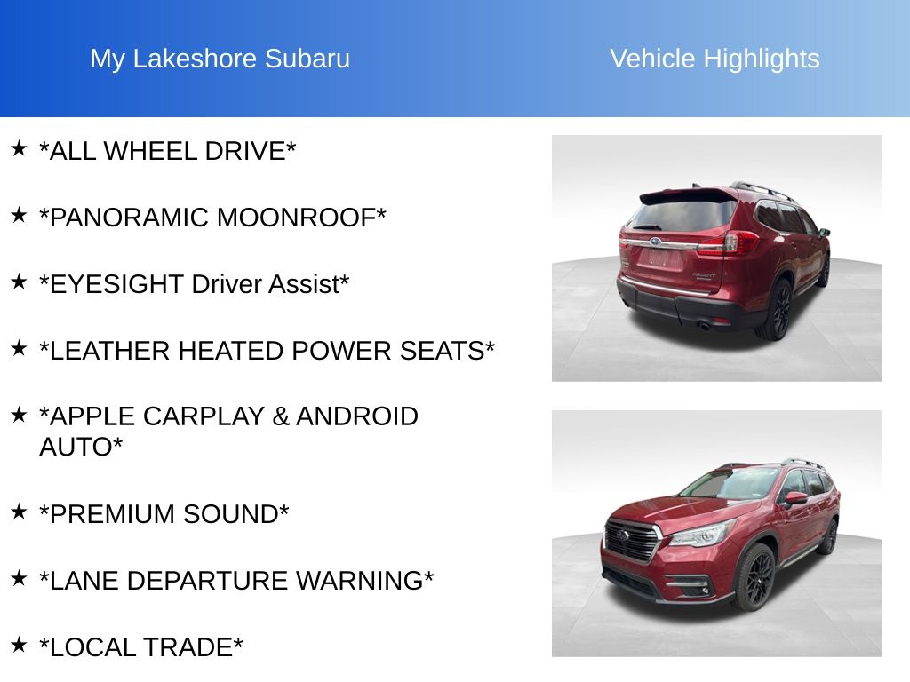 Ascent Limited, Crimson Red Pearl, *ALL WHEEL DRIVE*, *APPLE CARPLAY & ANDROID AUTO*, *EYESIGHT Driver Assist*, *LANE DEPARTURE WARNING*, *LEATHER HEATED POWER SEATS*, *LOCAL TRADE*, *PANORAMIC MOONROOF*, *PREMIUM SOUND*, Cargo Area Cover, Dual Glass Panoramic Power Moonroof, harman kardon & Moonroof & Nav & Cargo Area Cover, Radio: Subaru STARLINK 8.0" Multimedia Nav System. Crimson Red Pearl 2019 Subaru Ascent Limited AWD Lineartronic CVT 2.4L DOHC