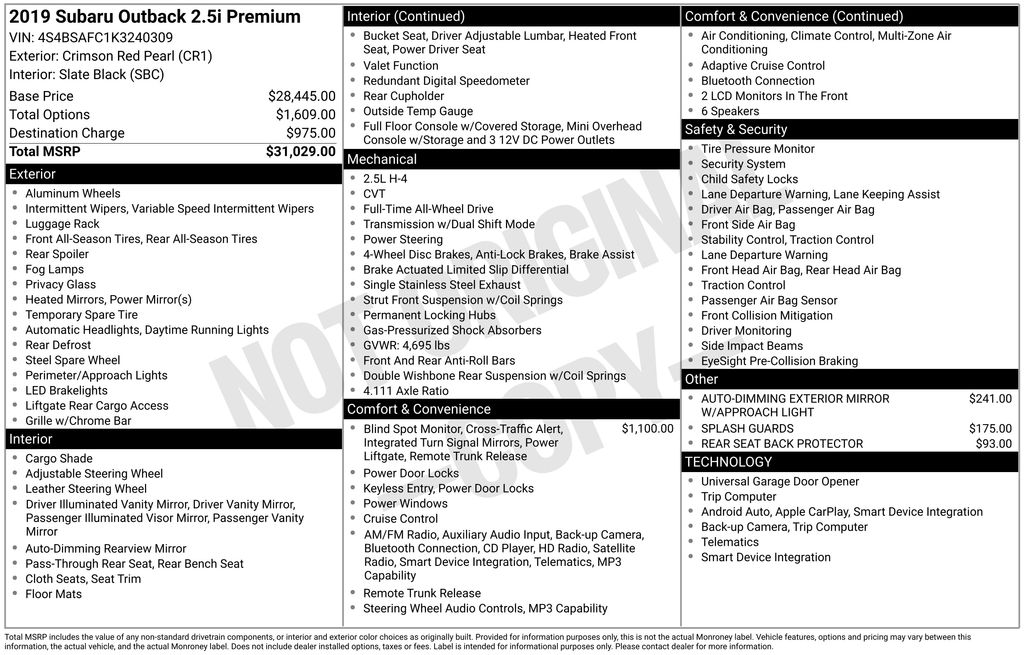 Recent Arrival! Crd 2019 Subaru Outback 2.5i Premium 2.5L 4-Cylinder DOHC 16V AWD
