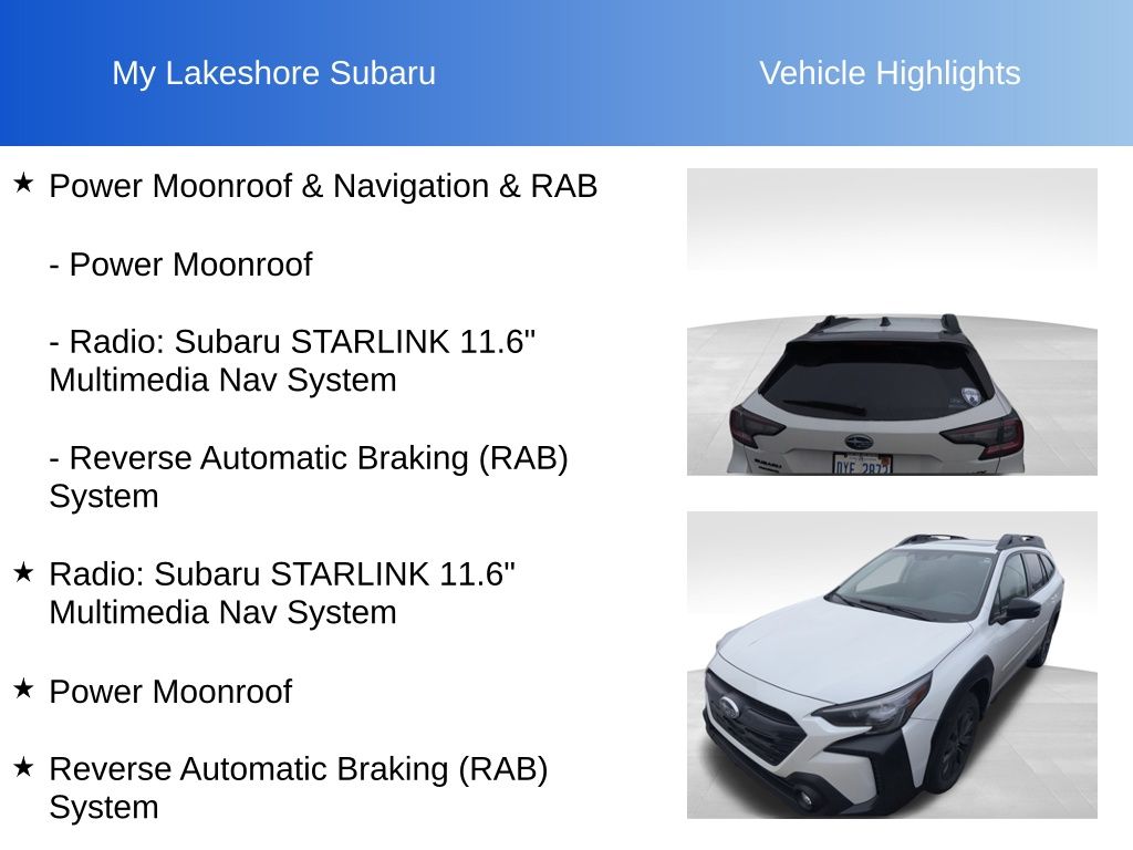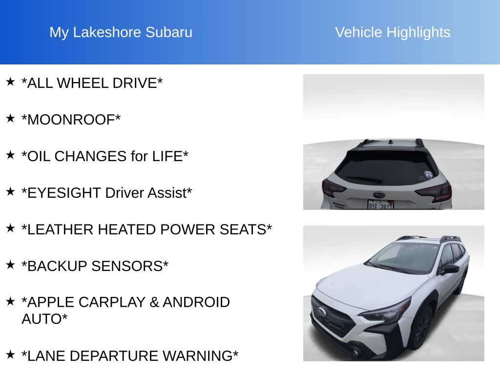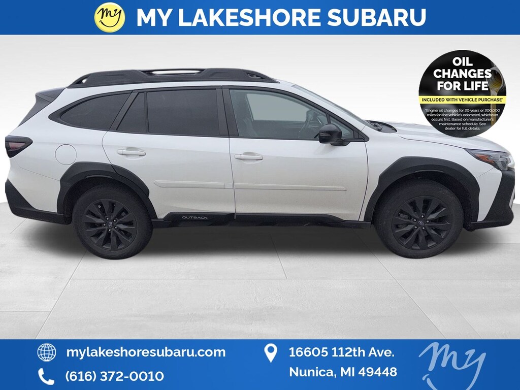 Outback Onyx Edition, Crystal White Pearl, *ALL WHEEL DRIVE*, *APPLE CARPLAY & ANDROID AUTO*, *BACKUP SENSORS*, *EYESIGHT Driver Assist*, *LANE DEPARTURE WARNING*, *LEATHER HEATED POWER SEATS*, *MOONROOF*, *OIL CHANGES for LIFE*, Power Moonroof, Power Moonroof & Navigation & RAB, Radio: Subaru STARLINK 11.6" Multimedia Nav System, Reverse Automatic Braking (RAB) System. Certified. Crystal White Pearl 2023 Subaru Outback Onyx Edition AWD CVT Lineartronic 2.5L 4-Cylinder DOHC 16V