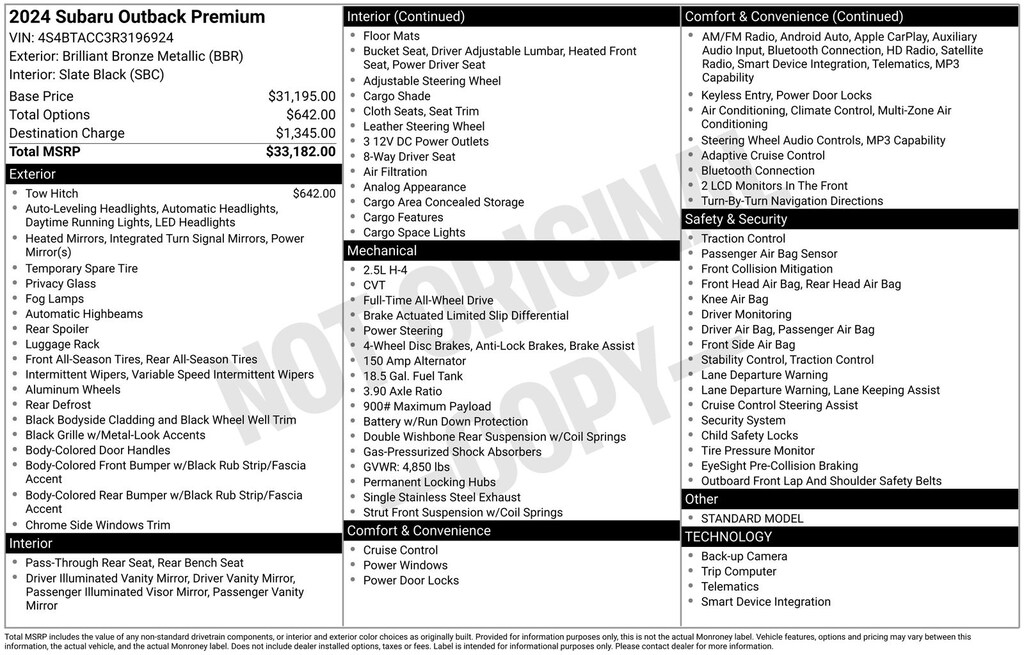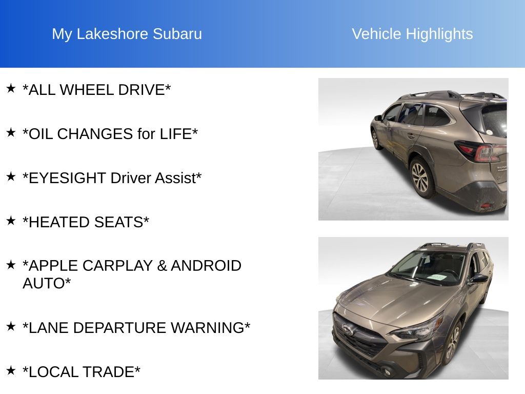 Outback Premium, Brilliant Bronze Metallic, *ALL WHEEL DRIVE*, *APPLE CARPLAY & ANDROID AUTO*, *EYESIGHT Driver Assist*, *HEATED SEATS*, *LANE DEPARTURE WARNING*, *LOCAL TRADE*, *OIL CHANGES for LIFE*. Certified. Brilliant Bronze Metallic 2024 Subaru Outback Premium AWD CVT Lineartronic 2.5L 4-Cylinder DOHC 16V