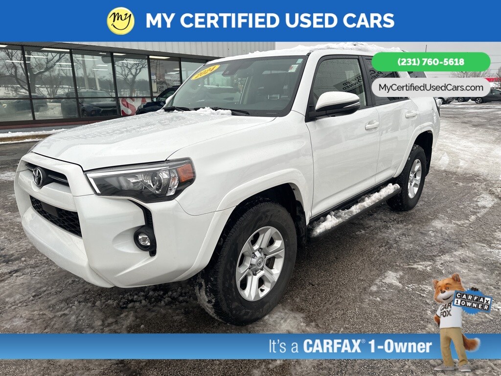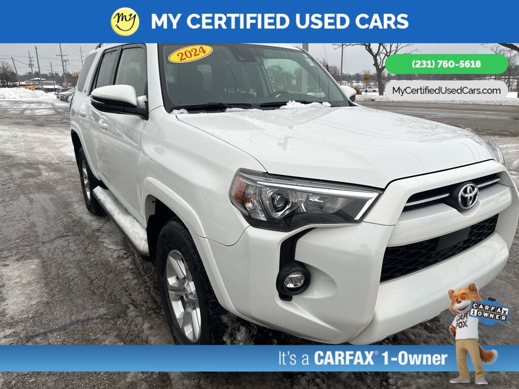 **ONE OWNER** **2024 TOYOTA 4RUNNER SR5 PREMIUM 4WD**, *SUPER BUY* *FULLY SERVICED* *LEATHER HEATED POWER SEATS* *NAVIGATION SYSTEM* *ADAPTIVE CRUISE*, *BLIND SPOT MONITORING SYSTEM*, *HANDSFREE BLUETOOTH*, *LANE DEPARTURE WARNING*, *REARVIEW CAMERA*, *APPLE CARPLAY & ANDROID AUTO* Active Cruise Control, Auto High-beam Headlights, Garage Door Opener, Hitch Ball Mount (TMS), Navigation System, SR5 Premium Package. MY Certified Used Cars of Muskegon is your #1 choice in Michigan to get the BEST PRICE on used vehicles and BEST value for your trade. The MY Certified Used Cars team is ready to provide you with a world-class experience, ensuring that you find the perfect vehicle that fits all your needs. Every vehicle has been through a full safety inspection completed by certified technicians and fully detailed. We sell many makes and models, Pre-Owned Vehicles with years from 2025-2024-2023-2022-2021-2020-2019-2018-2017-2016-2015-2014-2013-2012-2011-2010-2009-2008-2007 and all makes Audi, BMW, Chevrolet, Toyota, Volkswagen, Kia, Hyundai, Mercedes, Dodge, Chrysler, Jeep, Ram, Lincoln, Honda, Subaru, and many models like Bronco, Bronco Sport, Edge, Escapes, Expedition, Explorer, Fusions, Focus, Flex, F-150 Series, F-250, F-350, Super Duty Diesel Trucks, Maverick, Mustang MACH-E, Mustang, Ranger, Transit, Wrangler, Grand Cherokee, Grand Cherokee L, Wagoneer, Gladiator, Grand Caravan, RAM, RAM HEMI, and more. Take advantage of our VIP experience by calling 231-760-5618 to schedule a test drive. Read our customer reviews at www.mycertifiedusedcars.com/testimonials or view our entire selection of preowned vehicles at www.mycertifiedusedcars.com, or stop by today, located at 3692 Airline Rd. Muskegon, MI 49444. CARFAX One-Owner. White 2024 Toyota 4Runner SR5 Premium 4WD 5-Speed with ECT 4.0L V6 DOHC 24V Clean CARFAX.